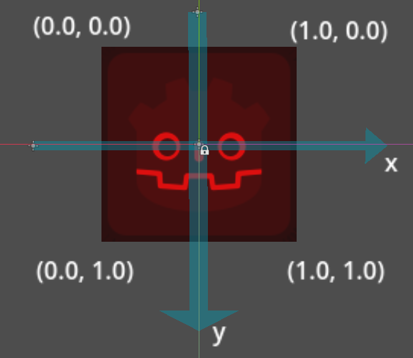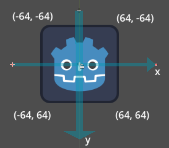 举个例子,比如有一个 Sprite2D,我们把默认的 icon.svg 拖拽到界面里,大小为 128 x 128,坐标原点在图片中心 (0, 0),此时图片有四个顶点 (-64, -64), (64, -64), (-64, 64), (64, 64)。