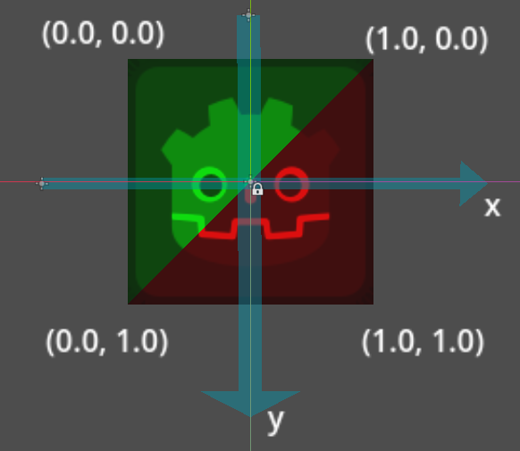 可以通过默认的纹理坐标变量 (UV) 控制当前像素的坐标,范围是 [0.0 - 1.0],2D 环境下就是横坐标 x 和纵坐标 y。比如根据坐标 x 和 y 位置让左上部分绿色,右下部分红色。横坐标 x 轴,左边为 0.0,右边为 1.0,纵坐标 y 轴,上边为 0.0,下边为 1.0。